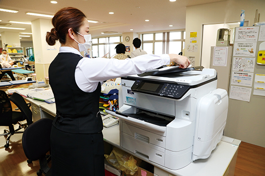 従来、必要に応じて部署ごとにプリンターを導入していた同院にとって、頻繁に発生する故障や消耗品交換への対応は大きな課題だった。用度課の西口妙子様によれば、「導入したプリンターには家庭用のものも多く、業務利用には耐久性が不足していました。修理の際の予備機の用意も必要でしたし、買い換える場合には、ストックしてあった交換部品や消耗品が無駄になっていました」とのこと。エプソンのスマートチャージで貸与されるビジネスインクジェットプリンターは、数十万枚の印刷枚数に対応するなど高耐久性を誇る。複数台契約の場合は、その月の基本印刷枚数を複数台まとめて計算し、分け合える「グループ割引」も活用でき、出力に関わる費用全体の削減も可能となる。西口様によれば、実際に使っている部署からも「インクが長持ちする」、「消耗品発注の手間が省けるのは大きなメリット」といった声があがっているという。大久保病院では、2020年11月時点で、合計14台を導入している。「部署によっては運用経費が従来の半分程度に抑えられているという印象です」(西口様)。国が進めている「地域包括ケアシステム」の構築や「地域医療構想」など、データ連携が進む医療業界だが、医療や介護の現場では、デジタルデータは活用しにくい場合も多い。紙による情報共有へのニーズは、むしろ高まるだろう。尾家事務長は、「現在、電子カルテ情報の印刷はレーザープリンターで行なっています。これが、エプソンのスマートチャージになれば、より大きなコスト削減が可能になると思います」という。エプソンが提供するプリンティングソリューションへの期待は大きい。