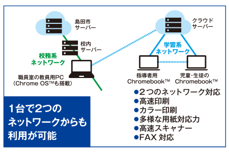 各校には、メイン機としてLX-10050MF1台、故障時にも対応できるようサブ機としてPX-M7070FX1台の計2台を設置し、学習系・校務系のプリンター&スキャナーとして使用しています。
