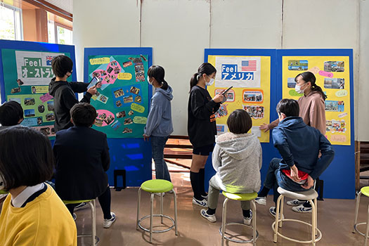当学園では、オーストラリアのケアンズにあるTAS(Trinity Anglican School)が姉妹校となっており、他にもラウンドスクエア(世界50カ国180校が加盟している国際的な私立学校同盟)により繋がりのある学校ともZoomを使ってオンラインによる国際交流を行っています。オンラインでは、画面内で視覚的にぱっと判ることが大事なので、その際には、ポスターやコラージュを作って説明するのにカラー印刷を多用しています。