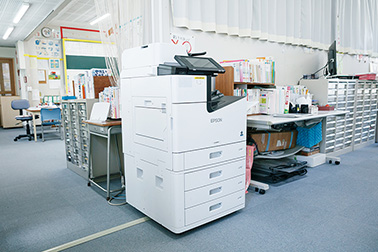 初等学校の職員室内印刷室には、中綴じフィニッシャーを装備したLX-10050MFを設置