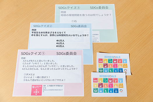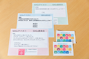 「SDGs未来都市」と関連したSDGs委員会のクイズ活動の掲示物やシール