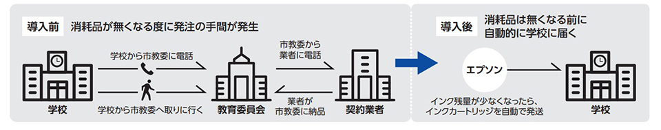以前は各校に、孔版印刷機1台、モノクロレーザープリンター1台、カラーレーザープリンター1台設置を基本に、学校により他にコピー機や複合機が設置されていました。基本分については教育委員会で全校分の機器を一括契約していたのですが、機器毎にリース会社や更新時期の違いがあって管理も大変でした。インク等の消耗品は、一括入札の方が安くなるため、教育委員会で1年間分をまとめて購入し業者が保管していて、必要な際は、学校⇒市教委⇒業者の順に電話して、教育委員会に納品してもらい棚に置き、学校から職員に取りに来てもらっていました。学校で導入した機器の消耗品については、各校配当予算で個々に購入や発注を行ってもらい、その分の伝票処理も手間でした。導入後は、消耗品が無くなる前に自動的に学校へ届くので、学校側のインクに関する電話連絡や、消耗品を取りに来る工数、教育委員会側の電話対応やリース更新の手間などが無くなり、業務が大幅に軽減されました。