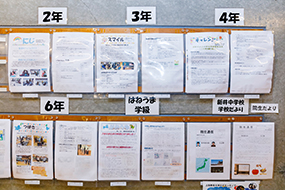 校舎入口付近には、カラー印刷の学校だよりや学年だよりなどを並べて掲示