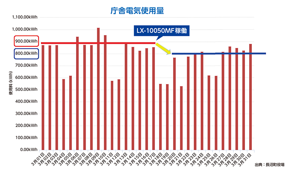 3月中旬に稼働を開始したのですが、その直後の半月で、電気代が前年・同月比で約25,000円も減り、1ヶ月に換算すると5万円もの削減になります。電気使用量の波形で見ても、稼働を開始した日から数値がボンと下がっていて、はっきりと節電効果を感じました。5月以降は新型コロナの制限が解除され、各種イベントや、定時後や土日の業務などが復活したので明確な比較はできませんが、年間で約60万円程度の電気代の削減を見込んでいます。