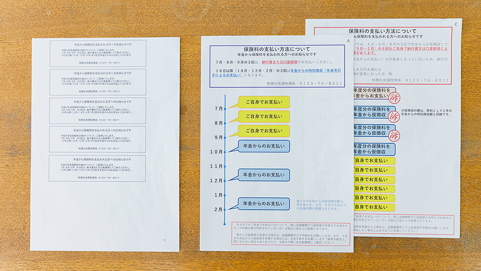 以前はモノクロで内容が分かりにくかった保険料の支払い方法の案内(左の印刷物)なども、カラーで表現することで見易く理解し易くなった。