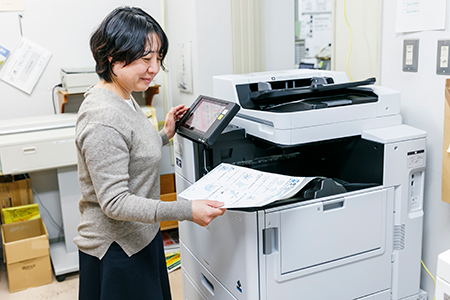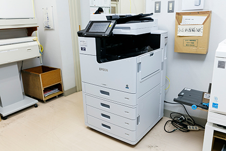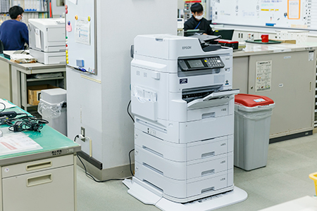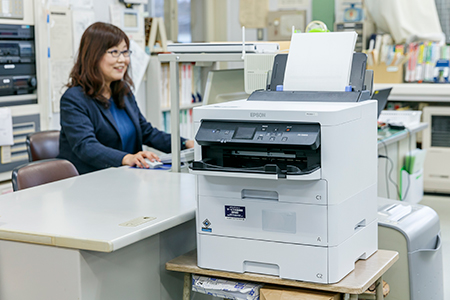 エプソンのカラーインクジェット複合機が導入されてからは、モノクロ・カラーの区別なく、印刷枚数が多くても気兼ねなく自席のPCから直接カラー印刷ができます。印刷スピードが速く、両面印刷も同時に行え、冊子印刷も機械に任せておけるようになったことで、印刷に縛られる時間が減少し、予想以上の業務効率化が図れました。
