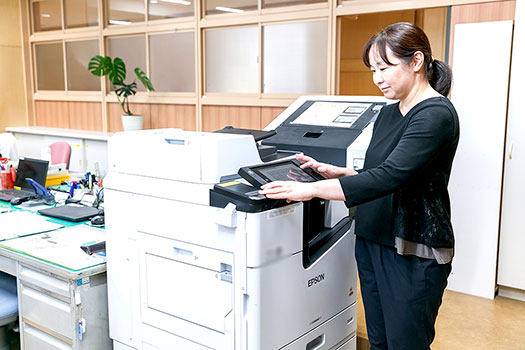 両面印刷のスピードも速く、画質も綺麗で、顔料インクなので滲んだり湿気で用紙が貼り付くこともなく、ADF(注1)でスキャンしたデータをEpson Connectを使ってクラウド上に保存もできるので、大変便利に活用されています。