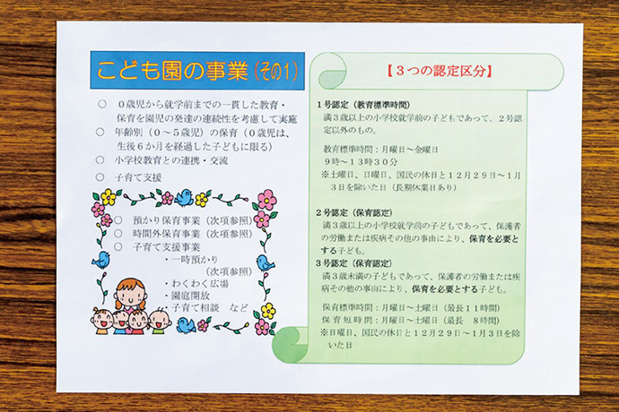 カラーイラストなどを使って見やすく分かりやすく、こども園の雰囲気を伝えている。