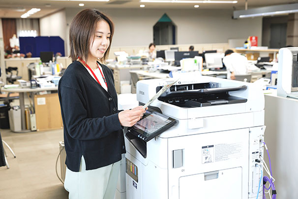 総務課では、これを実現するために、これまでにさまざまな方法を検討してきましたが、今回のエプソンのスマートチャージ対応の高速カラーインクジェット複合機の導入が、この打開策として大きく貢献してくれました。