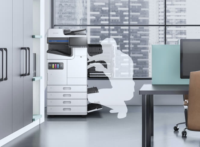 ブラック約69,000枚(注1)印刷できるインクカートリッジを搭載。インク切れによるダウンタイムを軽減できます。機体前面のカバーひとつ開けるだけで、インクカートリッジ・メンテナンスボックスすべて交換できるため、時間がかかりません。