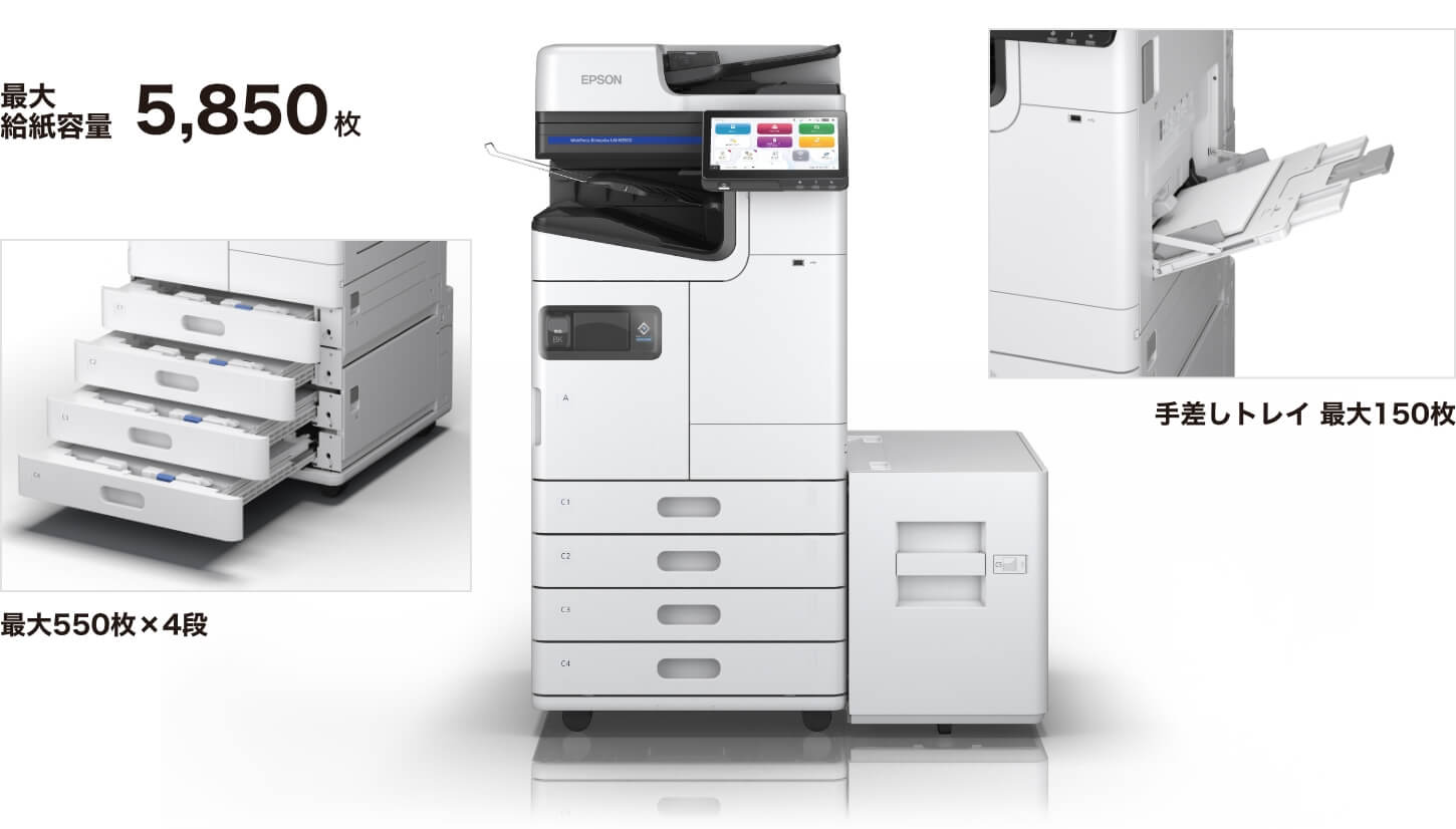 4段の給紙カセットに手差しトレイ、オプションの大容量給紙ユニットを加え6WAY給紙を実現。大量プリントが必要なオフィスでも用紙補給の手間を軽減しながら高い生産性を発揮します。カセットは、封筒やハガキなど多様な用紙に対応します。