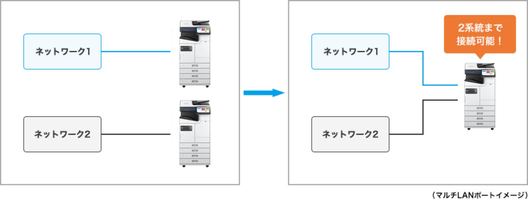 増設ネットワークインターフェースカード(注3)を付けることでLANポートを最大で2つにすることが可能です。自治体や病院など、用途に応じてネットワークを分けている場合でも、1つの複合機でプリントやコピーが可能です。