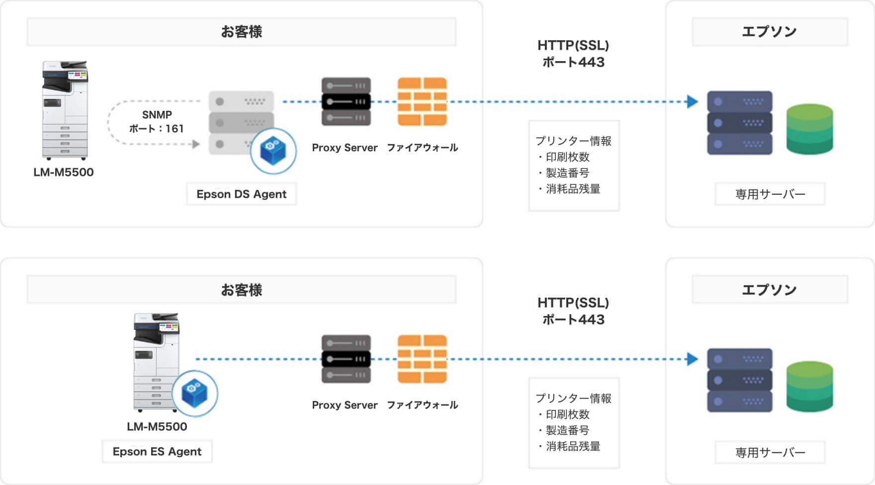 Epson DS Agent、Epson ES Agentで「エプソンのスマートチャージ」に使用する課金や消耗品情報と、サービス性向上(ダウンタイム最少化)に関わる情報を取得しています。Epson DS Agent、Epson ES Agentによる、リモートサービスの通信時のセキュリティー詳細につきましては、リモートサービスのセキュリティーをご覧ください。