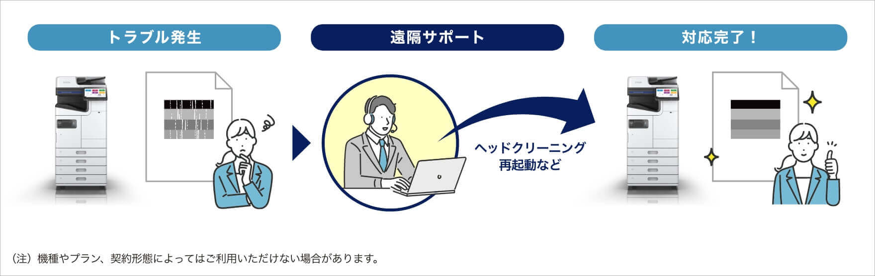 トラブルが起きた際、ヘッドクリーニングや再起動等、一部の操作について遠隔での対応が可能です。サービスマンが訪問することなくサポートできるので、ダウンタイムを最小化できます。