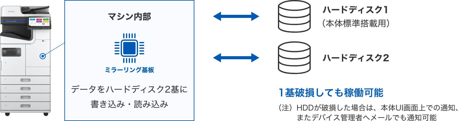 ミラーリング対応のハードディスクドライブにより、データの冗長性を向上できます。ハードディスクドライブが破損した場合に、本体画面での表示や管理者へのメール通知も可能です。
