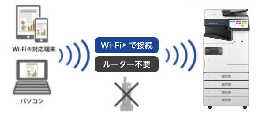 Wi-Fi Direct® 対応なら、最大8台までの端末と直接Wi-Fi® で接続ができます。急ぎの場合でも、PCを立ち上げることなく、手持ちのスマートフォンからメール文章や書類を簡単にプリントできます。