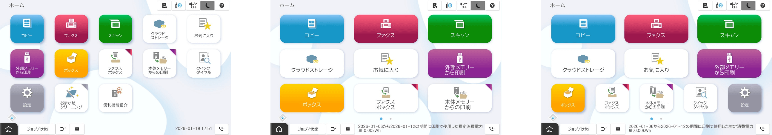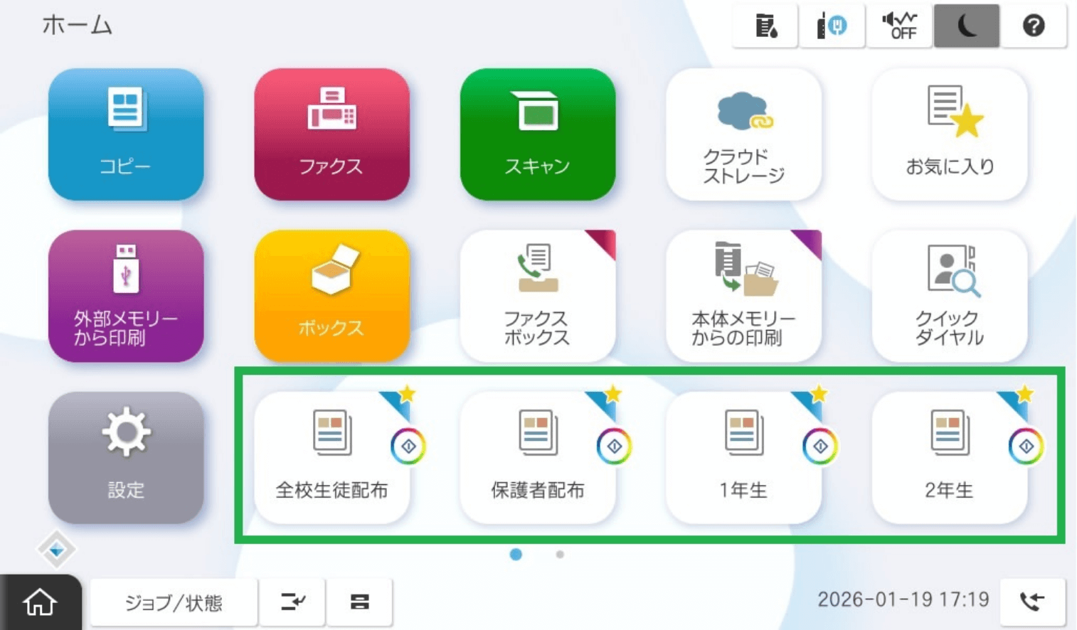 お気に入り登録したジョブを、ホーム画面からワンタッチで実行できます。コピーだけでなく、スキャンまで対応できるので、領収書や請求書の定型スキャン作業の効率化に貢献します。