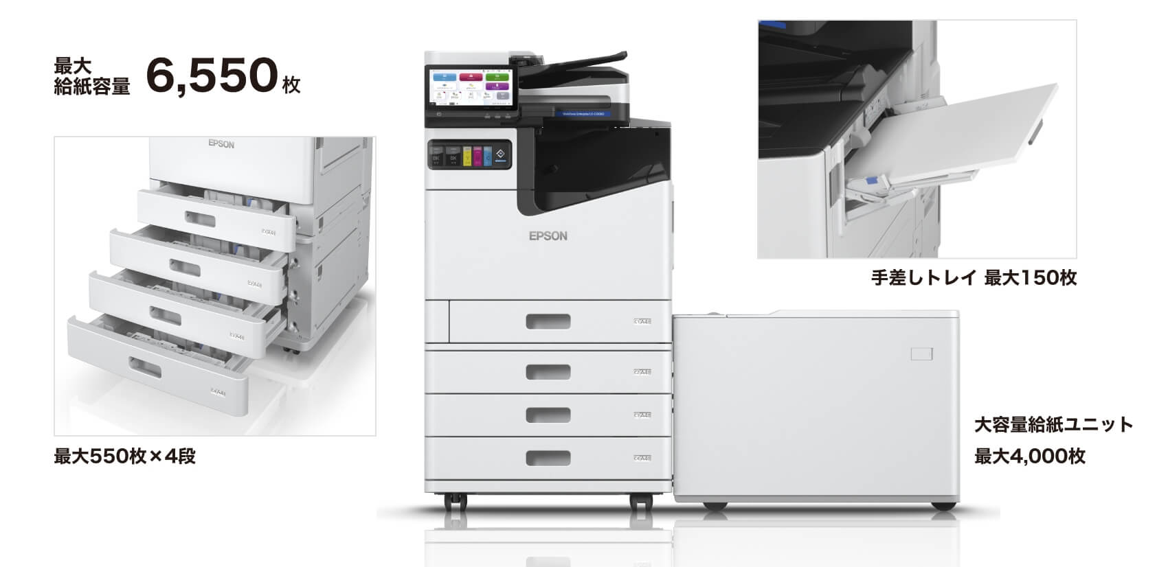 標準で4段の給紙カセットに手差しトレイ、オプションの大容量給紙ユニット(注1)を加え6WAY給紙を実現。