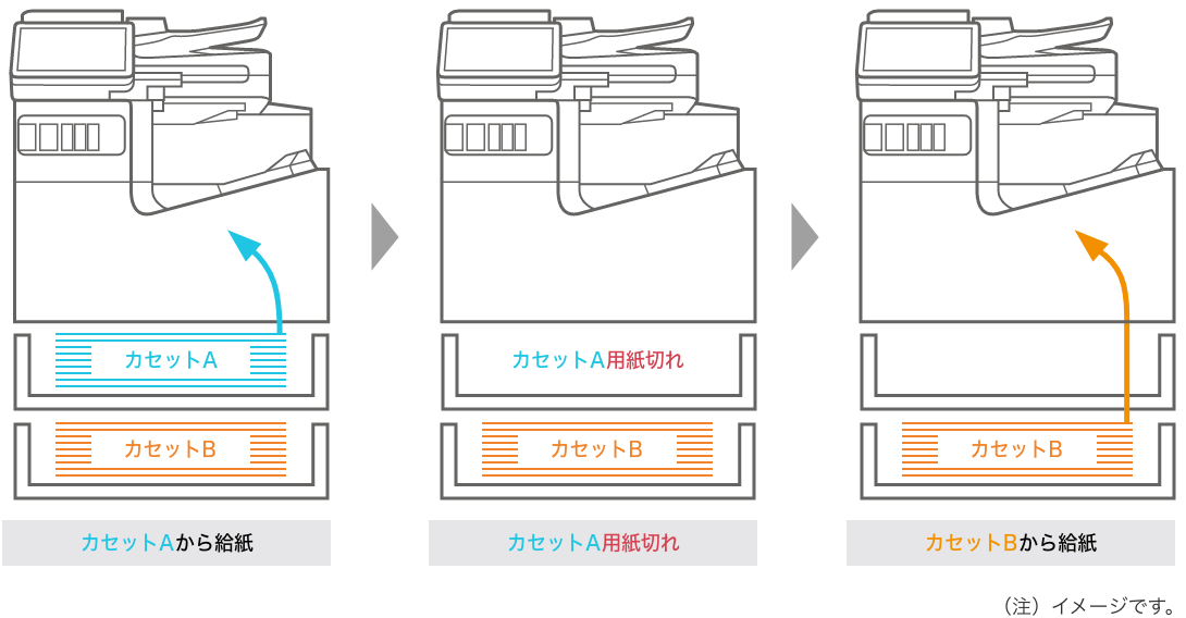 用紙の種類やサイズが同じであれば、給紙していたカセットが用紙切れになった場合でも、別のカセットから給紙開始。プリントが中断しません。