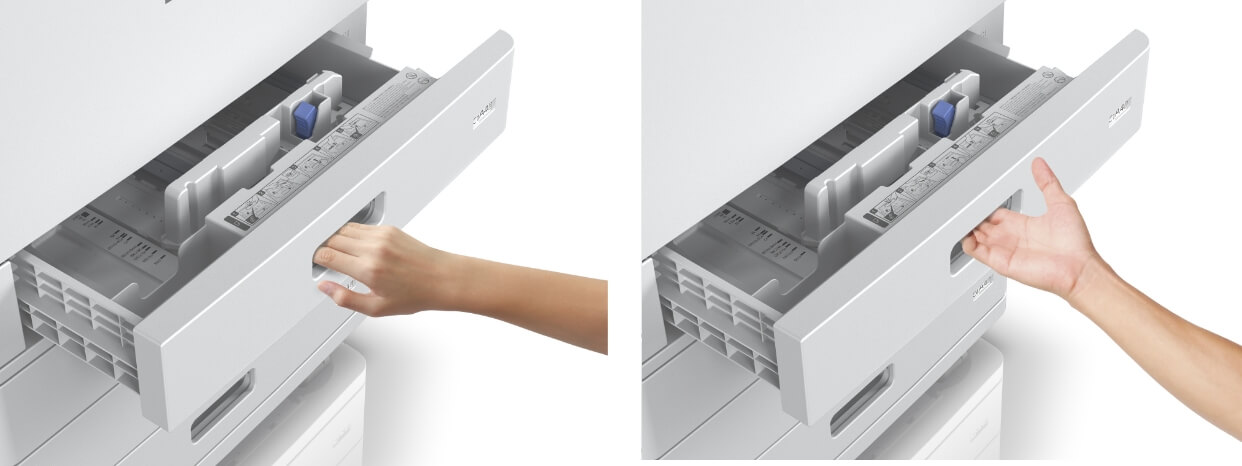 用紙カセットの引き出し感が軽く、また、カセットの取手部分は上からも下からもつかめるので、引き出しがスムーズ。用紙を楽にセットできます。