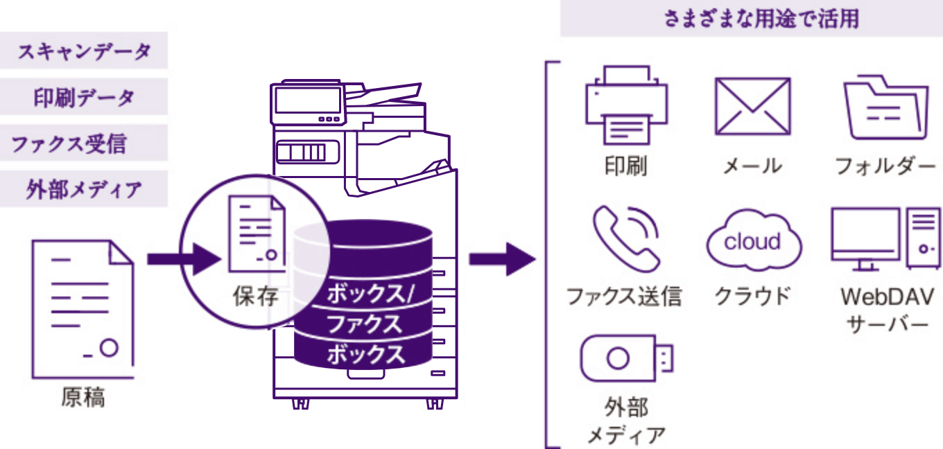 スキャンデータや印刷データを本体に保存し、必要な時に印刷やメール送信、ファクス送信などで活用することができます。保存データは文書名をつけて管理をしたり、簡単なページ編集が可能です。
