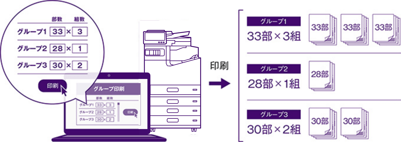 必要な部数をグループで登録しておけば、コピーや印刷時に設定を呼び出すことで、グループ毎に印刷や仕分けすることができます。印刷後の仕分け作業に時間を取られることがなくなります。
