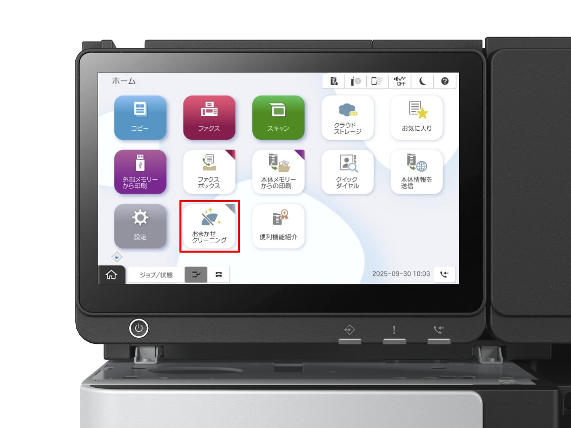 おまかせクリーニング機能は、パネルのTOP画面からすぐに操作可能です。万が一の目詰まりにも即座に対応できます。