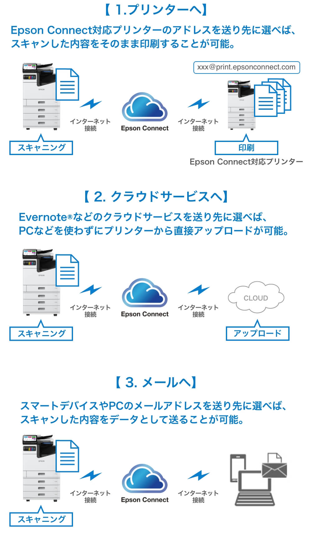 インターネットにつながった複合機でスキャンした写真やドキュメントをあらかじめ登録されたクラウドサービス(注1)へ送ることが可能。