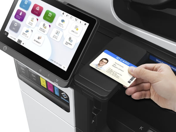 複合機のパネルでユーザーID、パスワードを手動で入力することなく、ICカードをかざすことにより、ユーザー認証を行うことが可能です。社員証や入退館システムで利用されているICカードを有効活用することも可能です(注2)。