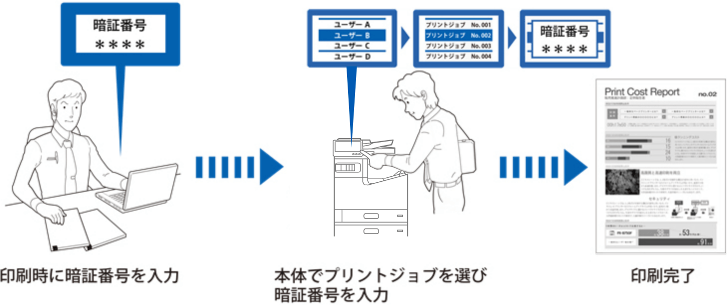 パスワードは印刷ジョブごとにプリンタードライバーで設定。印刷を実行すると印刷ジョブは一旦プリンターのメモリーに保存され、操作パネルでパスワードを入力すると出力されます。不特定多数でプリンターを共有するネットワーク環境でも、出力のセキュリティーを高めます。
