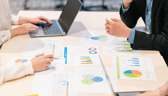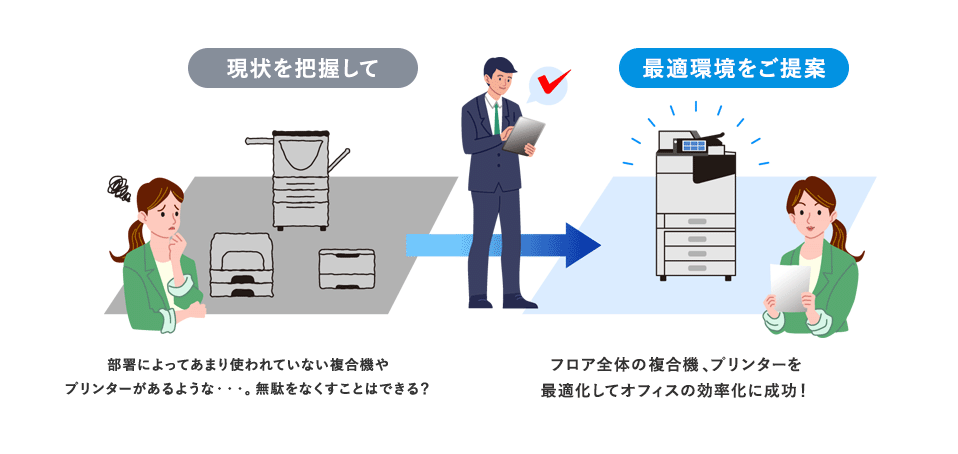 複合機やプリンターなどの出力機器からデータを収集し、専門家が分析・レポートをします。各機種の出力枚数、カラー比率、電力消費量などの把握はもちろんのこと、機器導入日からの経過状況といったエプソン独自の分析項目や出力機器を入れ替えた場合のコストシミュレーションも行い、最適な出力環境をご提案します。