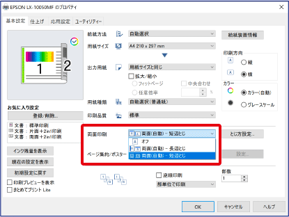 プリンタ―ドライバーで両⾯印刷を「オフ」→「両面」に変更することで、用紙の両面に印刷ができます。