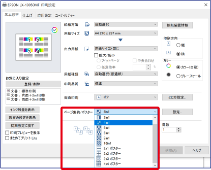 プリンタ―ドライバー「基本設定」タブのページ集約から1枚に何ページ集約するかを選ぶことで、1面に複数ページを集約して印刷ができます。