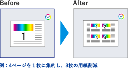 コピーやPCからの印刷時、1面に複数ページを集約して印刷することで出力枚数を削減できます。