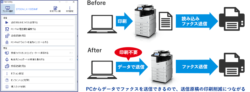 PCからファクス送信することで、ファクス原稿の出力が不要となり、出力枚数を削減できます。