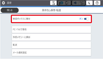 「ファクス設定」→「受信設定」→「保存転送設定」→「受信ボックスに保存」をオンにすることで、受信ファクスをパネルで確認してから出力させることができます。