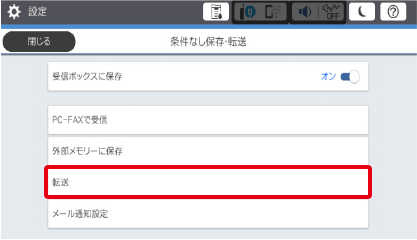「ファクス設定」→「受信設定」→「保存転送設定」→「転送」を選択し、転送先を⼊⼒することで、受信したファクスデータをメールやフォルダーに転送できます。
