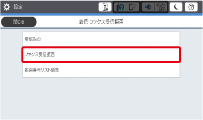 「ファクス設定」→「基本設定」→「着信・ファクス受信拒否設定」で迷惑ファクスの受信を拒否することができます。