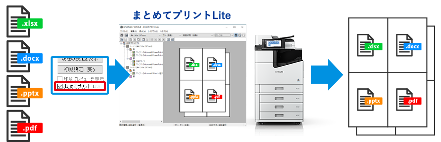 プリンタ―ドライバーにある「まとめてプリントLite」にチェックを⼊れると、複数のソフトやファイルの印刷を⼀つにまとめた後に、⼀括して印刷できます。印刷レイアウトも自由自在、印刷した後の資料を仕分ける手間も軽減できます。