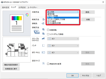 プリンタ―ドライバーの「仕上げ/応⽤設定」タブの印刷⽅法から「試し印刷」を選択すると、1部のみ排紙され、印刷物のレイアウトの確認ができます。その後パネルで継続して印刷、または印刷をキャンセルをすることができます。