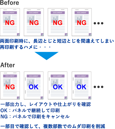 複数部印刷するときに、最初の1部だけ印刷して一旦停止します。印刷されたものを確認してから、2部目以降を印刷できるので印刷ミスが低減できます。