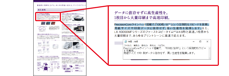 スキャンデータにOCRをかけて、テキストデータを抽出し、その結果を元の原稿の上に乗せた形でPDFファイルを作成することができます。