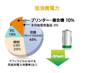 オフィスの電力消費(注1)に占めるプリンター類の割合は約10%。LX-10050MFの最大消費電力は320W。稼働時の消費電力だけでなく、待機時も含めたトータルの消費電力量を示すTEC値も0.57kWh(注2)(注3)と低く、一般的なレーザー方式からLX-10050MFシリーズに置換えることで優れた省電力性能でオフィスの省エネ活動に貢献します。したがって、SDGs7.3、7.aのエネルギー効率改善に貢献できます。