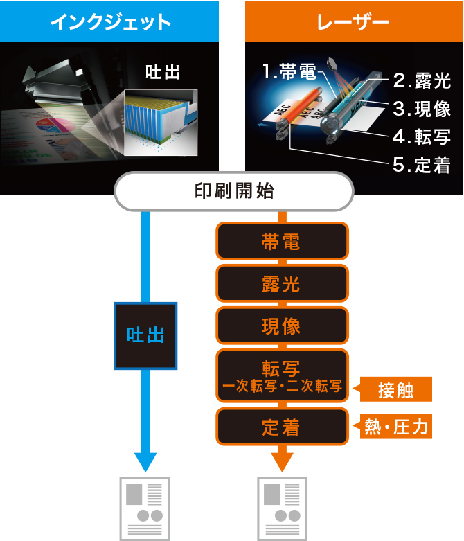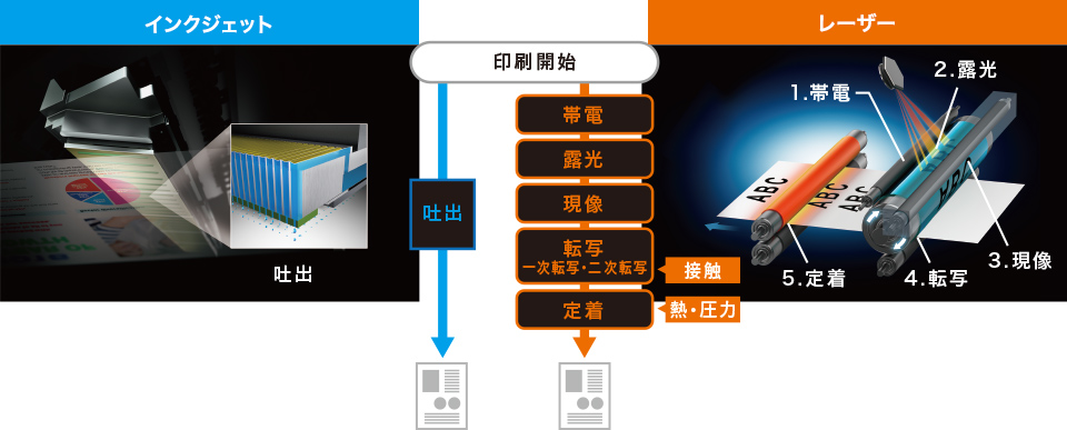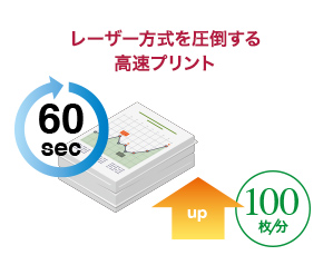インクジェットは印字ヘッドが紙に触れない非接触型。電気制御による独自のピエゾ方式で、100枚/分(注4)の高速印刷と同時に、高画質を実現。