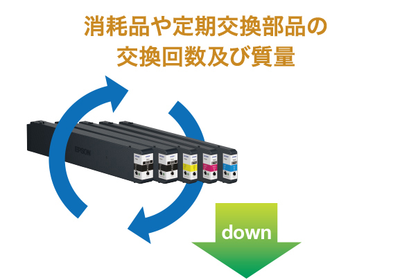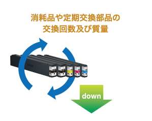 LX-10050MFシリーズは、大容量インクカートリッジと少ない定期交換部品により、省資源を実現。その結果、部品交換回数と必要な消耗品使用量をレーザープリンターに比べ低減することができ、SDGs12.2天然資源の効率的利用、12.5廃棄物発生の大幅削減に貢献できます。
