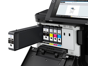 <LX>シリーズは、ブラック124,000枚(注1)、カラーは50,000枚(注1)のプリント/コピーが可能な大容量インクを搭載。ブラックは62,000枚(注1)プリントできるカートリッジを2本搭載しているので、1本目のインクを使いきっても自動的に2本目のインクに切り替わり、インク切れで業務をとめることはありません。