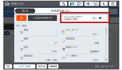 「お気に入り」で、よく使う設定をプリンター本体に登録ができます。