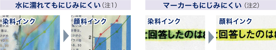 水やマーカーでもにじみにくい、全色顔料インク採用。強い耐水性で水性マーカーにもにじみにくいので、ビジネス文書はもちろん、幅広い用途のカラープリントを実現します。