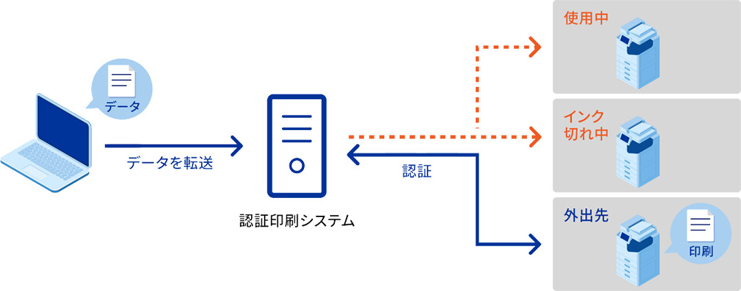 急いで印刷したいものがあるのに、普段使っている複合機が使用中で印刷できない。そんな時でも、認証印刷オプション「Epson Print Admin」の機能「どこでも印刷」を活用すれば、使用中、用紙やインク切れ、メンテナンス中等の複合機を避けて、空いている複合機からさらに、イントラネット内の環境なら、外出先の複合機でも印刷が可能。どのオフィスでも、設定不要でいつも通りの働き方ができます。