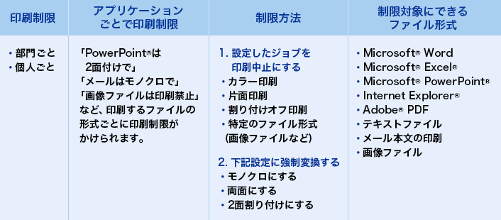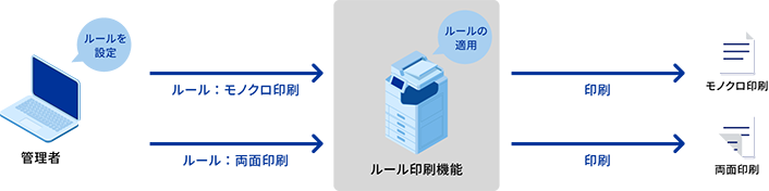 部門ごとや利用者ごとに、印刷のルールを設定することができます。例えば、PowerPoint® の印刷は2面付にする、Microsoft® Wordは両面印刷にする、などのルールを設定し無理なく使用枚数の削減が実施できます。